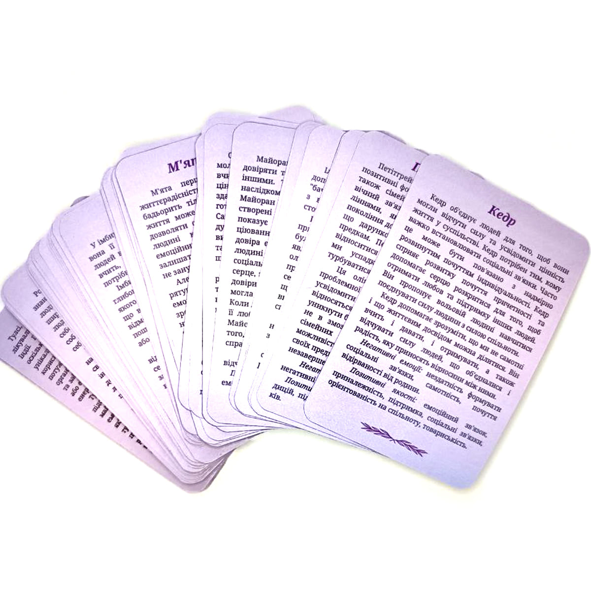 Картки будуть вашими надійними помічниками під час проведення аромакласів та аромадіагностики, адже досить складно одразу запам'ятати 60 емоційних характеристик олій.